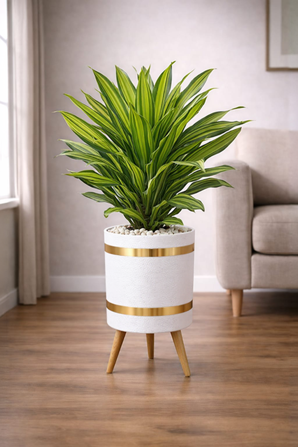Paired with a textured black planter featuring elegant gold accent bands and a sleek 3-leg wooden stand, this combo transforms any corner into a sophisticated décor statement. Finished with decorative white stones for a clean, luxury finish.